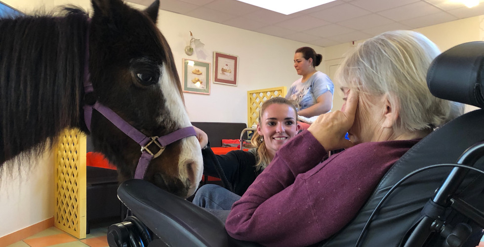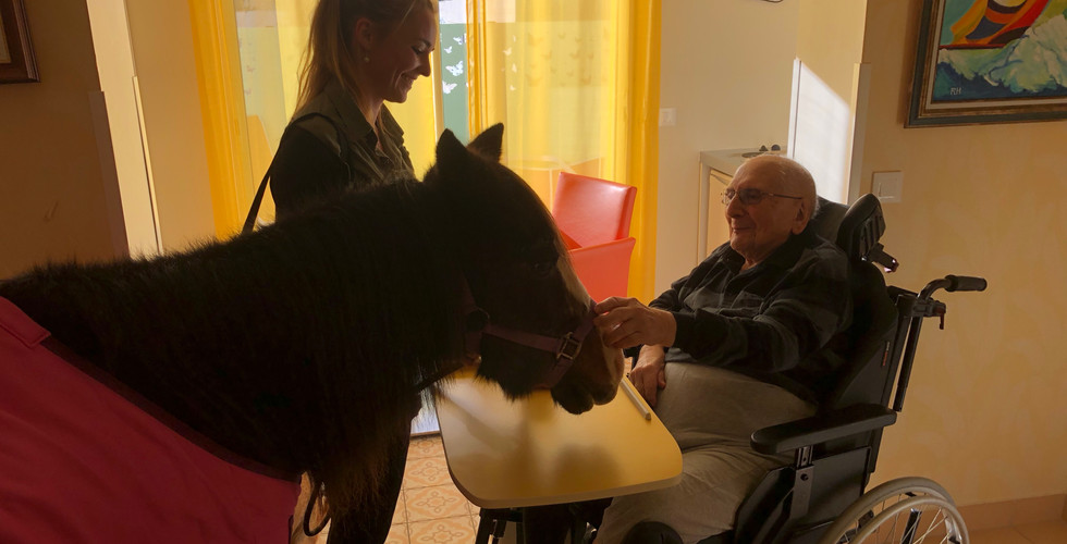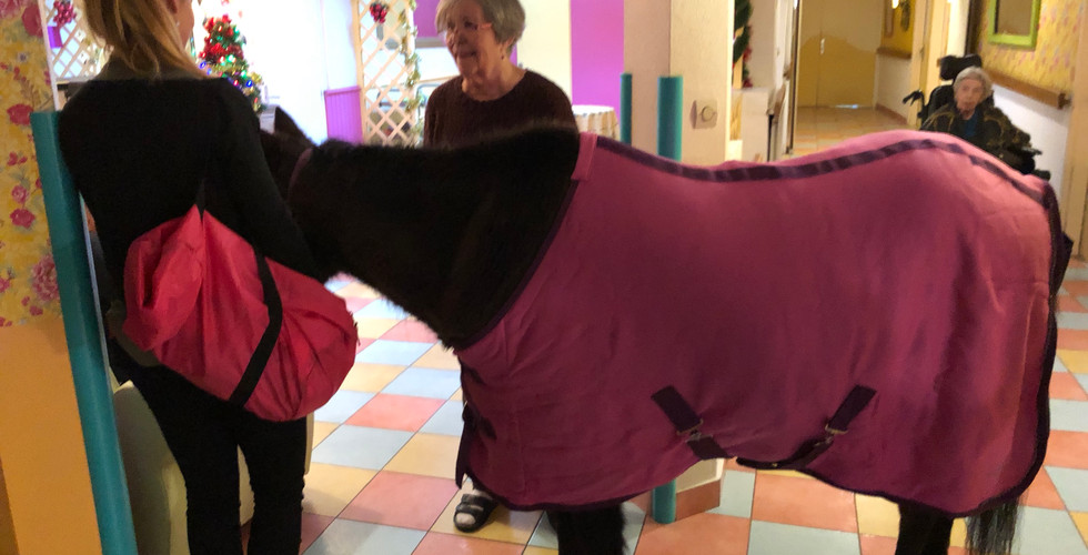 L'expression est vérifiée. Enzo et venue à notre rencontre. Enzo, le poney, s'est baladé une partie de la journée dans les couloirs de la résidence et dans les chambres pour le plus grand plaisir des personnes. Nous remercions Célia, Enzo et n'oublions pas Milou (le chien) qui lui aussi a pu jouer les stars d'un jour.